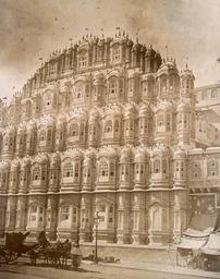 | Keywords: Hawa Mahal in the 1890s.jpg  en Photograph of the east façade of the Hawa Mahal Wind Palace at Jaipur in Rajasthan taken by Raja Deen Dayal Sons in the 1890s from the Curzon Collection 'Views of places proposed to be visited by Their Excellencies Lord Lady Curzon during Autumn Tour 1902' It was designed by Lalchand Usta and built by Sawai Pratap Singh r 1778-1803 in 1799 as an addition to the existing City Palace Like all the buildings in the old walled quarter of the city it is painted a rusty pink The building consists of two courtyards with residential ranges fronted by a five-storey façade with a curved roof-line shown in this view The façade is composed of a multitude of window bays arranged in tiers each crowned by an arch or dome The lattice-work designs of the windows created a purdah screen behind which ladies of the court in the zenana or women ™s quarters could observe the outside world in privacy and enjoy the breeze s 1890 http //www oldindianphotos in/search updated-min 2008-12-01T00 00 00 2B05 30 updated-max 2009-01-01T00 00 00 2B05 30 max-results 50 Creator Lala Deen Dayal Custom license marker 2014 09 07 1905 Uploaded with UploadWizard Black and white photographs by Lala Deen Dayal Hawa Mahal |