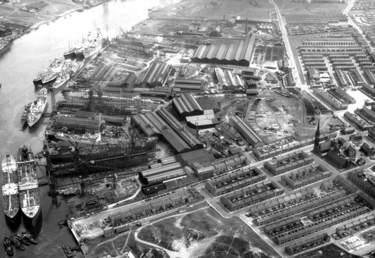 | Keywords: aerial photograph aerialphotograph south tyneside southtyneside hebburn hawthorn leslie hawthornleslie shipbuilding river tyne rivertyne industrial heritage industrialheritage black and white photograph blackandwhitephotograph crane shipyard turners ltd turnersltd 1957 june 1957 june1957 buildings roof wall vessels platform stucture frame mast deck cabin bar river water bank debris soil chimney slope window glass steel metel brick beam striking road path church pattern blackandwhite monochrome black and white Aerial view of the shipyard of Hawthorn Leslie, Hebburn, taken by Turners Ltd, June 1957 (TWAM ref. DT.TUR/2/17959F). Tyne & Wear Archives is proud to present a series of aerial photographs of South Tyneside. These images were captured by the Newcastle-based photographic firm Turners Ltd. Many of the images reflect the district's rich industrial heritage, showing businesses and places that no longer exist. We would be delighted if you could help us to tag these by adding the names of streets and buildings that you recognise. Old photographs can often stimulate distant memories and we would also love to hear any reminiscences that these images inspire (Copyright) We're happy for you to share these digital images within the spirit of The Commons. Please cite 'Tyne & Wear Archives & Museums' when reusing. Certain restrictions on high quality reproductions and commercial use of the original physical version apply though; if you're unsure please email archives@twmuseums.org.uk Aerial view of the shipyard of Hawthorn Leslie, Hebburn, taken by Turners Ltd, June 1957 (TWAM ref. DT.TUR/2/17959F). Tyne & Wear Archives is proud to present a series of aerial photographs of South Tyneside. These images were captured by the Newcastle-based photographic firm Turners Ltd. Many of the images reflect the district's rich industrial heritage, showing businesses and places that no longer exist. We would be delighted if you could help us to tag these by adding the names of streets and buildings that you recognise. Old photographs can often stimulate distant memories and we would also love to hear any reminiscences that these images inspire (Copyright) We're happy for you to share these digital images within the spirit of The Commons. Please cite 'Tyne & Wear Archives & Museums' when reusing. Certain restrictions on high quality reproductions and commercial use of the original physical version apply though; if you're unsure please email archives@twmuseums.org.uk |