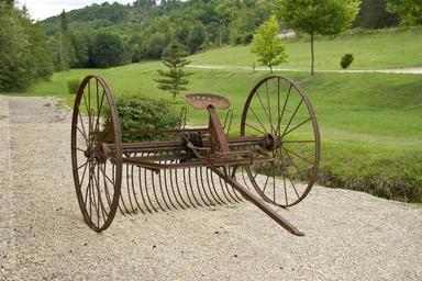 Keywords: hay rake ancient old agriculture farming antique equipment metal rusty wheel aged