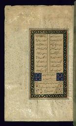 | Keywords: Haydar al-Husayni - Colophon - Walters W642112A - Full Page.jpg This colophon from Walters manuscript W 642 written in Arabic is dated 965 AH/AD 1557-1558 and gives the name of the scribe as Haydar al-Husayni It reads as follows katabahu al-'abd al-faqir al-mudhnib al-muhtaj ilá rahmat Allah /1/ wa-ghufranih Haydar al-Husayni ghaffara Allah lahu wa-li-man qara<'>ahu /2/ wa-nazara fihi sanat khams wa-sittin wa-tas'imi<'>ah /3/ 965 AH/AD 1557-1558 Safavid ink and pigments on cream-colored gold-sprinkled laid paper cm 24 5 15 accession number W 642 112A 82834 Unknown collection seal erased original shelfmark of 3934 on on tail edge of codex Henry Walters Baltimore date and mode of acquisition unknown Walters Art Museum Henry Walters Acquired by Henry Walters Transliteration place of origin Iran Walters Art Museum license 2D Subhat al-Abrar Rosary of the Devout by Jami Walters MS 642 |