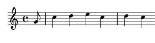 Keywords: Haydn-30-alleluia-theme.png en //cropped from lilypond code below theme doubled so it didn't stretch horizontally then cropped with Paint \version 2 11 63 set-global-staff-size 20 \score \new Staff \relative c \clef treble \key c \major \time 4/4 \partial2 \partial4 \partial8 g8 c4 d e c d c r4 r8 g8 c4 d e c d c \layout Own DavidRF 2009-03-26 PD-old Sheet music of Joseph Haydn |