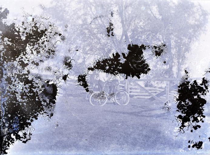 Keywords: bicycles 1890s women snow outdoor Two women [?] and a bicycle in front of a fence with trees behind them. One of a set of glass negatives associated with Herbert 'Burt' Rathbun (1861-1897). The negative is badly damaged. Two women [?] and a bicycle in front of a fence with trees behind them. One of a set of glass negatives associated with Herbert 'Burt' Rathbun (1861-1897). The negative is badly damaged.