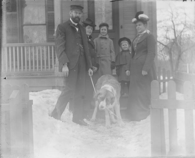Keywords: men women children dogs winter clothes 1890s houses monochrome blackandwhite black and white A man, two women, two children and a dog standing on the front steps of a house in the snow. One of a set of glass negatives associated with Herbert 'Burt' Rathbun (1861-1897). The man could be Burt, and one of the women his wife Agnes (formerly Bell). A man, two women, two children and a dog standing on the front steps of a house in the snow. One of a set of glass negatives associated with Herbert 'Burt' Rathbun (1861-1897). The man could be Burt, and one of the women his wife Agnes (formerly Bell).