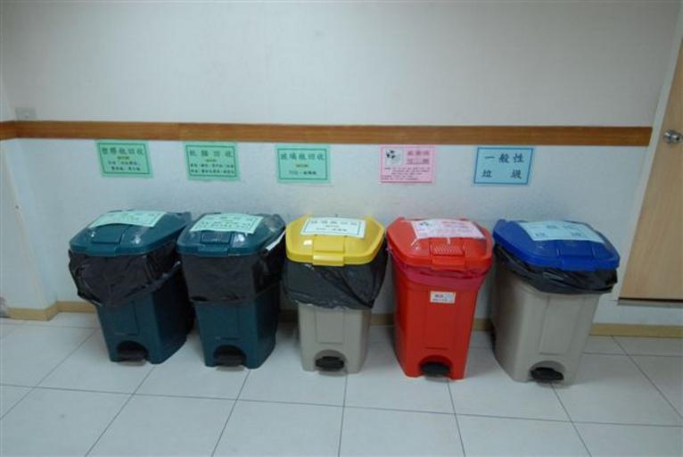 Keywords: HCCH Assort of transh cans.JPG en HCCH assorted of colorful trash cans for medical wastes own Jackhsiao 2008-03-05 Hsiao Chung Cheng Hospital Sorted waste containers in Taiwan
