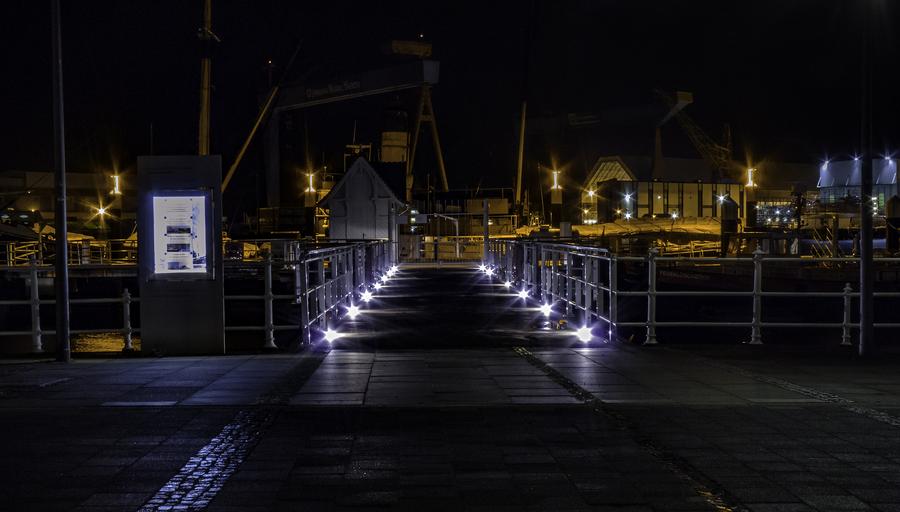 Keywords: hdw crane kieler firth seestrasse lights port long exposure sea water boats light shipping illuminated bank keel at night bootssteeg evening night photograph mood lighting harbour entrance reflection romantic