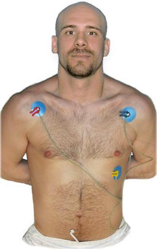 Keywords: heart monitor ekg ecg electrocardiogram electrocardiograph defibrillator medical clinical doctor technician hospital chest electrodes male man men guy guys bare hairy people indoor 3-wire EKG 3-wire EKG