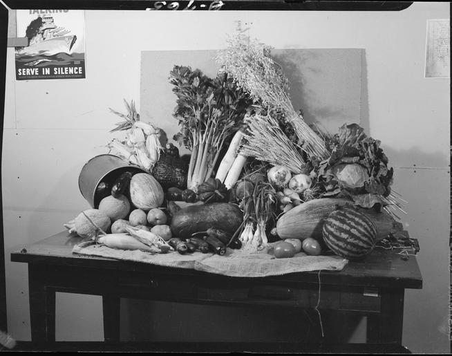 | Keywords: Heart Mountain Relocation Center, Heart Mountain, Wyoming. "Harvest is on at Heart Mountain". This . . . - NARA - 539594.tif Scope and content The full caption for this photograph reads Heart Mountain Relocation Center Heart Mountain Wyoming Harvest is on at Heart Mountain This picure shows some of the fifty-two varieties of crops grown by the Agricultural Section of the Heart Mountain Center Crops shown in this picture is as follows left to right cantaloupe egg plant potatoes pop corn sweet corn casaba melon hubbard squash bell pepper watermelon zucchini squash pascal celery table queen squash nerima daikon table beets green onions tomatoes banana squashed carrots dry onion wheat rye cabbage and striped watermelon General notes 539594 Local identifier 210-G-G765 Department of the Interior War Relocation Authority 02/16/1944 - 06/30/1946 Still Picture Records Section Special Media Archives Services Division NWCS-S National Archives at College Park 8601 Adelphi Road College Park MD 20740-6001 1944-10-03 Record group Record Group 210 Records of the War Relocation Authority 1941 - 1989 Record group ARC 537 Central Photographic File of the War Relocation Authority compiled 1942 - 1945 Series ARC 536000 File unit File unit ARC Variant control numbers NAIL Control Number NWDNS-210-G-G765 yes Other versions <gallery> File Heart_Mountain_Relocation_Center _Heart_Mountain _Wyoming _ Harvest_is_on_at_Heart_Mountain _This_ _ _ _-_NARA_-_539594 tif tif File Heart_Mountain_Relocation_Center _Heart_Mountain _Wyoming _ Harvest_is_on_at_Heart_Mountain _This_ _ _ _-_NARA_-_539594 jpg jpg </gallery> NARA-cooperation PD-USGov Heart Mountain War Relocation Center NARA TIF images with categorized JPGs |