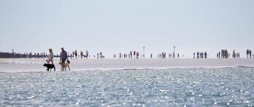 Keywords: heat haze hot weather beach sea sand spit dog walkers