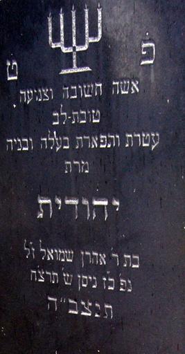 | Keywords: Hebrew inscription on Jewish cemetery in Bielsko-BiaÅ‚a.jpg en Hebrew inscription on jewish cemetery in Bielsko-BiaÅ‚a - grave of Julia Mückenbrunn פ״ט acronyme de פה טמון ici est enterré ¦ pl Hebrajska inskrypcja na cmentarzu żydowskim w Bielsku-BiaÅ‚ej - grób Julii Mückenbrunn own Gaj777 2008-03-29 49 49 3 4 N 19 1 34 5 E Jewish cemetery in Bielsko-BiaÅ‚a Jewish inscriptions in Poland Hebrew writing Hebrew language Shabbat Candles on Jewish gravestones in Poland | ||||