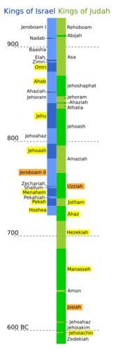 Keywords: Hebrew Kings in Archaeology.svg en Timeline showing the kings of Israel and Judah highlighting those known from contemporary extrabiblical sources Kings whose identification is accepted by scholarly consensus are highlighted in yellow tentatively identified kings are highlighted in orange 2015-11-10 Dates taken from Edwin R Thiele The Mysterious Numbers of the Hebrew Kings Kregel Academic 1983 p 217 https //books google com/books id Wx4GsZH3dzAC pg PA217 in Google Books Archaeological data compiled from sources at w List of biblical figures identified in extra-biblical sources this file should be updated to reflect the information on that page Lindert other versions other fields Information field Notes Reigns are shown to scale and rounded to whole years Where Thiele specified a pair of years the earliest is used Reigns shorter than one year are depicted as if they lasted one year for the sake of visibility Co-reigns as well as the reign of Tibni rival of Omri during the latter's first years are omitted to keep it readable cc-zero Monarchs of the Hebrew Bible Uploaded with UploadWizard |