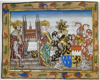 | Keywords: Heinrich und Kunigunde mit dem Bamberger Dom.jpg de Heinrich II und Kunigunde mit dem Bamberger Dom und dem Wappen des Fürstbischofs Georg III Schenk von Limpurg aus dem gedruckten Bamberger Missale von 1507 Staatsbibliothek Bamberg RB Inc typ V 11 unbez Bl 8v own photograph of a display in the Bamberg Diözesanmuseum 1507 Anonymous PD-old-100 Historic views of Bamberger Dom Henry II Holy Roman Emperor Cunigunde of Luxemburg Coats of arms of bishops of the Roman Catholic Archdiocese of Bamberg Derivatives of the Coat of arms of Bamberg diocese Location not applicable Derivatives of the Coat of arms of Schenken von Limpurg family Collections of Staatsbibliothek Bamberg Coats of arms of Cunigunde of Luxemburg Coats of arms of Henry II Holy Roman Emperor Georg III Schenk von Limpurg ImageNote 1 771 1222 170 203 2468 1961 2 en Coat of arms of Cunigunde of Luxemburg ImageNoteEnd 1 ImageNote 2 569 1239 193 199 2468 1961 2 en Coat of arms of Henry II Holy Roman Emperor ImageNoteEnd 2 ImageNote 3 1236 444 1036 1268 2468 1961 2 en Coat of arms of Georg III Schenk von Limpurg Bishop of Bamberg ImageNoteEnd 3 |