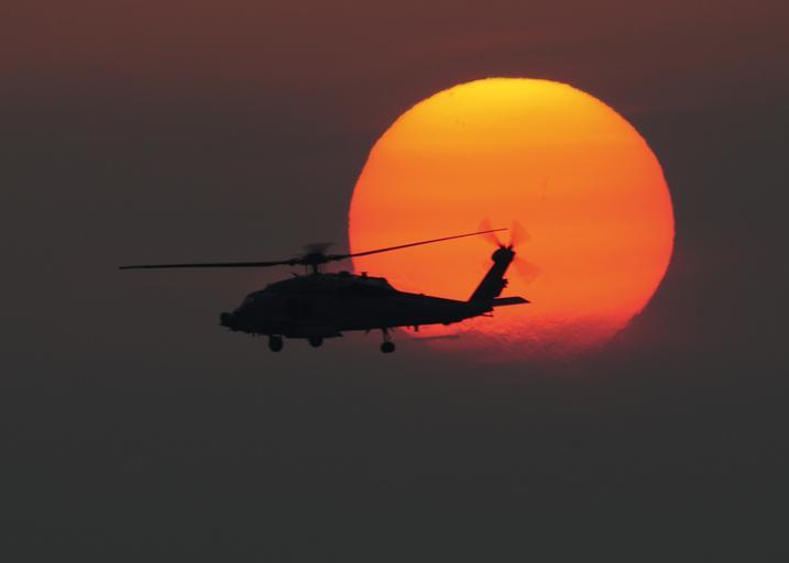 Keywords: helicopter military sun sunset silhouette sea hawk flying aircraft aviation colorful sky transport travel