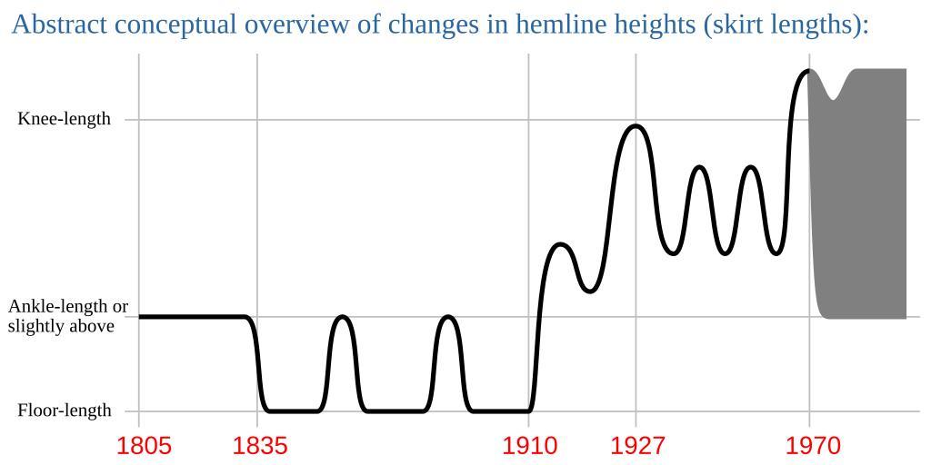 | Keywords: Hemline (skirt height) overview chart 1805-2005.svg An abstract conceptual overview graph of changes in hemline heights skirt lengths in middle- and upper-class western women's clothes over two hundred years 1805-2005 The curve in this image is not based on exact numerical data but instead presents a summary of broad general trends i e the graph is more qualitative than quantitative or not to precise scale Before World War I the hemlines of middle- and upper-class adult women's ordinary public clothes in western societies had varied only between floor length and an inch or two above ankle length at most for centuries This graph shows how things then changed in a previously-unprecedented way On the left hemline height is indicated as being at ankle length or slightly above at the chronological start date of 1805 i e 200 years before the date the first version of this chart was made then dropping to floor-length ca 1835 where it stayed for most of the remainder of the 19th century with a few temporary excursions back to ankle-length -- see File 1794-1887-Fashion-overview-Alfred-Roller GIF During WW1 hemlines rose far above ankle-length relatively quickly -- and then in the mid 1920's after a brief dip rose almost all the way to knee length During the period from the early 1930's to the mid 1960's hemlines fluctuated in a zone which was quite different from the zone where hemlines had fluctuated during the 19th century In the late 1960's hemlines rose significantly above knee length for the first time In the early 1970's some women stayed with the miniskirt some women went to the other extreme of ankle-length granny dresses while fashion designers tried to push an intermediate midi skirt length see illustrations from September 1971 issue of Women's Wear Daily on p 473 of Survey of Historic Costume ISBN 1-56367-142-5 The strong rejection by women of the attempt to impose the midi as the new norm marked the end of only one skirt-length at a time -- while fashion trends continued to come and go from the 1970's on it was no longer true that a woman had to wear one particular socially-predominating skirt-length or be considered almost hopelessly unstylish Instead a variety of skirt-lengths now became acceptable though after the early 1970's the miniskirt itself didn't return as a mainstream fashion until the mid-1980's -- and of course in many contexts women are free to wear trousers instead of a skirt or dress This era of relative fashion freedom is shown as the dispersed grey area on the right of the chart The curve and gray area shown in the graph are loosely based on information from a number of sources and historical illustrations The graph itself was made from scratch by H Churchyard in April 2005 and modified for Wikipedia and uploaded to Wikimedia Commons in June 2008 Graphic made by H Churchyard in April 2005 modified for Wikipedia and uploaded to Wikimedia Commons June 2008 Graphic made by H Churchyard in April 2005 modified for Wikipedia and uploaded to Wikimedia Commons June 2008 For the skirt lengths of little girls' clothes which before the 1930s were often much shorter than the skirt lengths of adult women's clothes see Image 1868-skirt-lengths-girl-ages-Harpers-Bazar gif 19th-century fashion 20th-century fashion Dress diagrams Line charts SVG clothing |