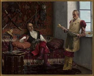 | Keywords: Henryk Weyssenhoff Scena szlachecka - Historia jataganu.jpg Artwork Creator Henryk Weyssenhoff 1891 oil canvas cm 73 90 Institution National Museum Warsaw accession number MP 5357 object history credit line http //cyfrowe mnw art pl/dmuseion/docmetadata id 3463 show_nav true cyfrowe mnw art pl See below Custom license marker 2015 06 15 PD-Art Uploaded with UploadWizard Paintings by Henryk Weyssenhoff 19th-century Polish paintings in the National Museum in Warsaw Polish nobles costumes Axes in art Yatagans Karabela Kilims Szyszak Gunpowder flasks |