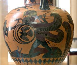 Keywords: Herakles Geryon Cdm Paris 202.jpg Inscription Painter Heracles fighting with Geryon dying Orthrus and Eurytion on the ground Chalcidian black-figured amphora from South Italy ca 540 BC Combat d'Héraclès contre Géryon Orthos et Eurytion gisent au sol Amphore chalcidienne à figures noires d'Italie du Sud v 540 av J -C H 41 cm 16 in Museum Cabinet des Médailles CVA France 7 III E pl 24 num 1 “4 pl 25 object history credit line Feoni Magnoncourt and Luynes Collection; gift 1862 accession number De Ridder n 202 User Bibi Saint-Pol own work 2007-05-25 other versions <gallery> Image Cattle of Geryon Cdm Paris 202 jpg Other side </gallery> Cabinet des médailles Paris De Ridder 202