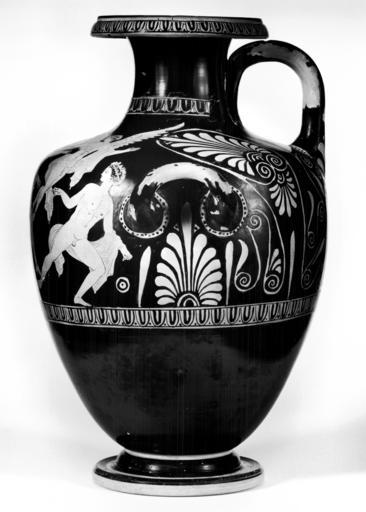 | Keywords: Herakles Painter - Red-Figure "Kerch-Style" Hydria - Walters 48263 - Left Side.jpg The amorous interactions of humans and immortals achieve a light-hearted almost dance-like quality on this hydria or water-jug Hermes in the center pursues a youth towards the right with Eros floating above them On the left a satyr advances from below towards a maiden who attempts to flee ca 360 BC Classical terracotta cm 31 3 19 9 h x diam ; at handles cm 25 1 w accession number 48 263 31250 Arthur Sambon Paris 1920 mode of acquisition unknown no 20 Henry Walters Baltimore 1926 mode of acquisition unknown Walters Art Museum Henry Walters Acquired by Henry Walters 1926 Things With Wings Mythological Figures in Ancient Greek Art The Walters Art Museum Baltimore 2005-2006 Things With Wings Mythological Figures in Ancient Greek Art Ward Museum Salisbury 2009 place of origin Athens Greece Walters Art Museum license Ancient Greek red-figure pottery in the Walters Art Museum Herakles Painter Media contributed by the Walters Art Museum needs category review |
