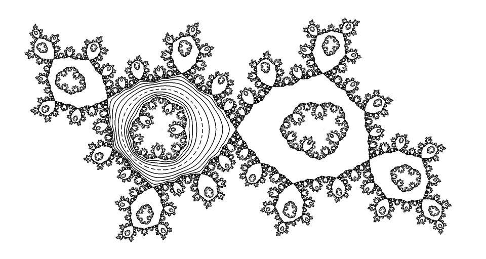 | Keywords: Herman Standard.png en It's a standard image of Julia set of the rational function e<sup>2 it</sup> z<sup>2</sup> z 4 / 1 4z with t 6151732 chosen so that the rotation number is 5 1 /2 which possess a Herman ring own Yangfei math 2010-06-06 Here is an example of a rational function which possesses a Herman ring <math>f z \frac e 2 \pi i \tau z 2 z - 4 1 - 4z </math> where <math>\tau 0 6151732\dots</math> such that the rotation number of on the unit circle is <math> \sqrt 5 -1 /2</math> The picture shown on the right is the Julia set of the curves in the white annulus are the orbits of some points under the iterations of while the dashed line denotes the unit circle Herman ring of period 1 and rotation number the golden mean Compare with <gallery> File Herman-ring-1 png image of the same Julia set with src code but worse quality </gallery> References <references/> Complex analysis Mathematical theorems Herman ring Complex rational maps |
