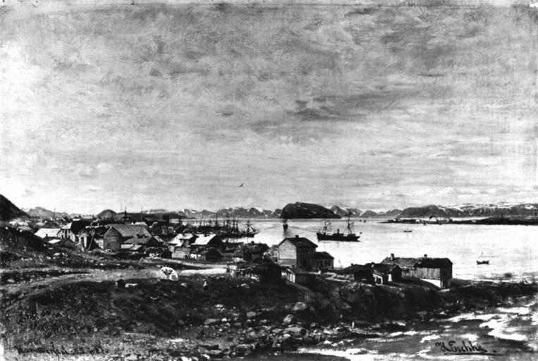 Keywords: Hermann Eschke - Ansicht von Hammerfest.jpg Artwork Creator Hermann Eschke Ansicht von Hammerfest 1887-07-25 oil canvas cm 30 48 5 LangSwitch verschollen missing object history früherer Verwalter Berlin Staatliche Museen Nationalgalerie alte Inventar-Nr ohne Nummer Zugang Vermächtnis 1916 mit der Sammlung Freund übernommen <br/>Auslagerungsort Berlin Volksgerichtshof Zugang Leihgabe vor 1941/1943 credit line Signatur Datierung H Eschke Hammerfest 25 87 Anbringungsort unten accession number 02521410 PD-old-100 Hermann Eschke Historical images of Hammerfest town Lost paintings 1887 paintings Images from Bildarchiv Foto Marburg Black and white reproductions of paintings in color Paintings of norwegian villages 1887 oil on canvas paintings Hammerfest in art
