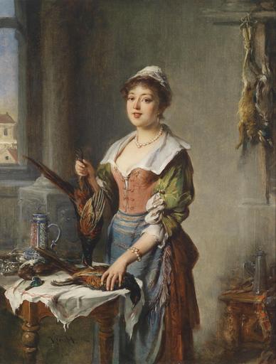 | Keywords: Hermann Kern Wildbrethändlerin.jpg Wildbrethändlerin Kern H signature oil canvas 70 5 × 42 cm http //www dorotheum com by 1940 creator Hermann Kern PD-old-100 Images from Dorotheum Phasianidae in art Hermann Kern Paintings of women standing in kitchens Dead hares in art Dead birds in art Upside down Paintings of women with birds People wearing bracelets Standing females in art Females in rooms in art Females looking at viewer in art People and walls in art | ||||