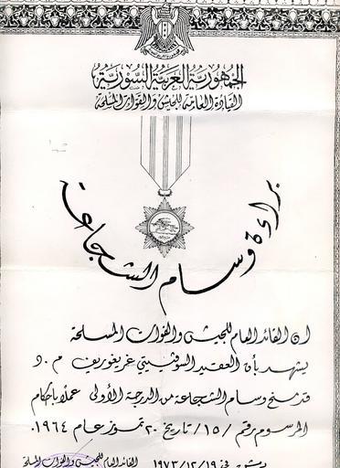 | Keywords: Hero of Syria citation.jpg ar وصف مجموعات الجدارة البطل الجمهورية العربية السورية ---- en Hero of Syria citation issued to a Soviet militaryman who fought Isaelis Americans and joint NATO force of British French and Italian military components in the Middle East and thus has been considered to be an eligible candidate to receive the supreme Syrian award ---- ru аг адной лист на советского военнослужащего участника боевых действий на Ближнем Востоке Ге оя Си ийской А абской Республики http //ak-group ru/forum/attachment php attachmentid 30911 d 1268487029 Hero of Sirya citation 22px en President of Syria President of the Syrian Arab Republic President of the Syrian Arab Republic circa 1970 1980 s PD-Syria Orders decorations and medals of Syria Arab-Israeli conflict Documents of Syria Soviet experts in Arabic Armies |