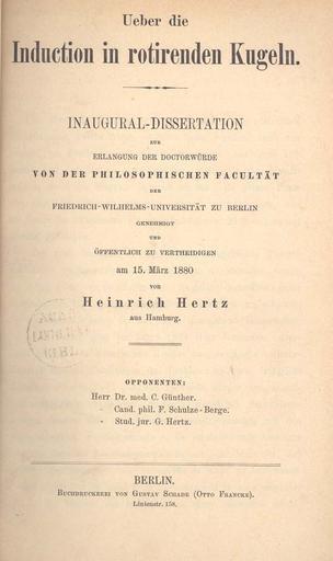 | Keywords: Hertz1880.jpg en Heinrich Hertz Ueber die Induction in rotirenden Kugeln Dissertation Berlin 1880 Friedrich-Wilhelms-Universität Berlin 1880 http //bc ub leidenuniv nl/bc/tentoonstelling/hora_est/inleiding html Leiden University Library Heinrich Hertz 1857-1894 PD-old-70 Uploaded with UploadWizard Heinrich Rudolf Hertz Dissertations Humboldt-Universität Berlin Printed works Leiden University Library Photographs uploaded by User Vysotsky | ||||