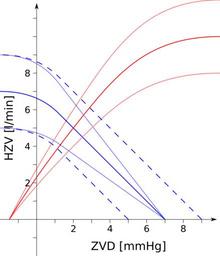 | Keywords: Herz-Kreislauf-Diagramm.svg  de Herz-Kreislauf-Diagramm mit Herzfunktionskurve in rot und Gefäßfunktionskurve in blau Der Schnittpunkt beider Kurven liefert den zentralen Venendruck und das Herzzeitvolumen unter verschiedenen Kreislaufbedingungen 2016-05-28 own Nescimus other versions cc-zero Cardiovascular physiology |