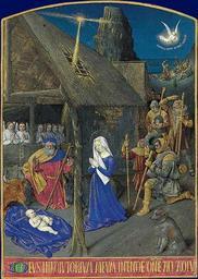 | Keywords: Heures d'Étienne Chevalier - Nativité.jpg Artwork creator Jean Fouquet L'Enfant Jésus entouré du boeuf de saint Joseph l'âne et de la Vierge dans la crèche entourés d'anges A droit se présentent les bergers à qui est apparu un ange dans une scène représenté au loin Une étoile surplombe la scène et l'illumine à travers un trou dans le toit ca 1452-1460 illumination parchment cm 16 5 12 institution Musée Condé Bibliothèque Condé Nicole Reynaud Jean Fouquet - Les Heures d ™Ã‰tienne Chevalier Dijon Faton Ž 2006 280 p ISBN 2-87844-076-5 object history Ancien livre d'heures commandé par Étienne Chevalier trésorier du roi Charles VII Démembré et les miniatures découpées au début du XVIIIe siècle puis montées sur une planchette de bois par un menuisier encadreur parisien vers 1790 Propriété de Georg Brentano puis acquis auprès de son fils par Henri d'Orléans duc d'Aumale en 1891 Donné à l'Institut de France exhibition history Présenté dans le Santuario du musée depuis 1897 interdit de sortie du château de Chantilly en raison des conditions du don du duc d'Aumale credit line R -G Ojeda RMN ; http //expositions bnf fr/fouquet/grand/f075 htm exposition bnf fr accession number Ms 71 PD-Art-100 Hours of Étienne Chevalier 09 Miniatures of the nativity of Jesus Christ |