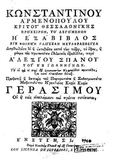 | Keywords: Hexabiblos - Constantine Harmenopoulos - 1744 - Venice - first page.jpg en Front page of the Procheiron or Hexabiblos of Constantine Harmenopoulos 1320 - 1380/1385 Venice 1744 edition by Alexios Spanos first known translation in modern Greek Hexabiblos was a Byzantine legal treatise of the 14th century that continued to be widely used in the Balkan lands throughout the later Ottoman Empire's presence At 1828 it was adopted by the newly founded Greek state as the state's civic code where it remained so until 1946 el Η αρχική σελίδα της του Προχείρου ή Εξάβιβλου του Κωνσταντίνου Αρμενό ουλου 1320 - 1380/1385 έκδοση του 1744 στη Βενετία α ό τον Αλέξιο Σ ανό ρώτη γνωστή μετάφραση στα νέα ελληνικά Η Εξάβιβλος ήταν μια Βυζαντινή νομική ραγματεία η ο οία συνέχισε να χρησιμο οιείται ευρέως στα Βαλκάνια κατά τη διάρκεια της μετέ ειτα Οθωμανικής αυτοκρατορίας Το 1828 το έργο αυτό υιοθετήθηκε ως ο νομικός κώδικας του νεοιδρυθέντος Ελληνικού κράτους ό ου και αρέμεινε σε ισχύ ως το 1946 1744 http //anemi lib uoc gr/search/ search_type simple display_mode overview stored_cclquery creator 28 CE 91 CF 81 CE BC CE B5 CE BD CF 8C CF 80 CE BF CF 85 CE BB CE BF CF 82 20 CE 9A CF 89 CE BD CF 83 CF 84 CE B1 CE BD CF 84 CE AF CE BD CE BF CF 82 29 rss 0 number 10 keep_number 10 offset 1 Constantine Harmenopoulos original Alexios Spanos translator/editor other versions Venice Italy Custom license marker 2015 02 14 PD-old-100-1923 Byzantine writers Law books Books in Greek Uploaded with UploadWizard |