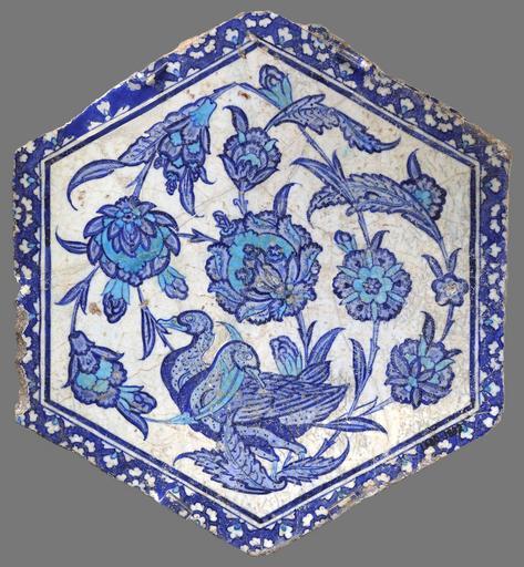 | Keywords: Hexagonal Iznik tile with ducks V&A 1680-1892.jpg Hexagonal tile with ducks painted in cobalt blue and turquoise place of creation Iznik Turkey 1525-1550 but note below implies a date of 1540-1546 Fritware/stonepaste with underglaze decoration in cobalt blue and turquoise Width 27 9 cm Institution Victoria and Albert Museum Atasoy Nurhan; Raby Julian 1989 Iznik The Pottery of Ottoman Turkey London Alexandra Press ISBN 978-1-85669-054-6 </br> cite journal Lane Arthur 1957 The Ottoman Pottery of Isnik Ars Orientalis 2 247 “281 https //www jstor org/stable/4629039 seq 1 page_scan_tab_contents JSTOR 4629039<br>Porter Venetia 1995 Islamic Tiles London British Museum Press ISBN 978-0-7141-1456-9 object history credit line The tile is illustrated in B W in Lane 1957 p 266 and fig 36 This tile is one of 39 tiles or tile fragments in the V A Museum that the museum believes come from the Hayreddin bathhouse Cinili Hamam or Tiled bathhouse located on Itfaiye Street in Istanbul This is explained in the entry for another tile with http //collections vam ac uk/item/O224115/tile/ Inv no 961-1892 The bathhouse was built by Barbaros Hayreddin PaÅŸa in 1540-1546 Barbarossa died in 1546 The building was sold off in the 19th century and the remaining tiles removed and sold The V A has another similar tile http //collections vam ac uk/item/O225308/tile-unknown/ Accession number CIRC 30-1953 There are identical tiles in the Harvard Museums http //www harvardartmuseums org/collections/object/316973 Accession number 9 2006 and the British Museum http //www britishmuseum org/research/collection_online/collection_object_details aspx objectId 238595 partId 1 Accession number 1892 0613 69 The example in the British Museum is illustrated in Porter 1995 p 105 fig 93 and Atasoy Raby 1989 p 134 fig 225 in B W There are also two identical tiles in the Leighton House Museum in London that are plastered into the north wall of the central hall accession number http //collections vam ac uk/item/O224585/tile-unknown/ 1680-1892 own photo date 2015 Aa77zz artwork license PD-old-100 photo license other versions İznik ceramics Ottoman art in Victoria and Albert Museum Plant-scroll ornament |