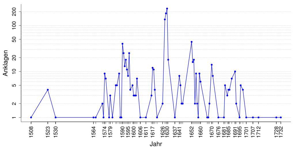 | Keywords: Hexenanklagen Herzogtum Westfalen 1508–1732 logscale.svg de Das Diagramm gibt die Zahl der Hexenanklagen im Herzogtum Westfalen zwischen 1508 und 1732 wieder Die Daten sind insofern nicht vollständig weil unbestimmte Angaben wie mehrere einige usw nicht berücksichtigt wurden Die Daten für die Grafik stammen von Rainer Decker Die Hexenverfolgungen im Herzogtum Westfalen In Alfred Bruns Red Hexen Gerichtsbarkeit im kurkölnischen Sauerland Schmallenberg 1984 S 213-218 2011-12-14 own El Grafo thumb left without logscaled y-axis cc-zero v set working directory setwd /path/to/your/directory/ <- the path to the folder that contains data csv read the data dat <- read csv data csv The default settings for labels and tick marks are not sufficient for this data set so we have to work arond that This vector contains the years we want to be displayed below the x-axis labyears <- c 1508 1523 1530 1564 1574 1579 1590 1595 1600 1606 1611 1617 1626 1630 1637 1641 1652 1660 1670 1676 1681 1685 1691 1695 1701 1707 1712 1728 1732 open an SVG-device svg filename Hexenanklagen Herzogtum Westfalen 1508 “1732 logscale svg width 14 height 7 pointsize 12 set the margins around the plotting area bottom left top right par mar c 6 5 1 1 set up the basic plot plot Angeklagte ~ Jahr data dat bty l type n don't plot any data yet xaxt n don't display any labels or ticks for the x-axis yaxt n don't display any labels or ticks for the y-axis cex lab 1 8 magnify labels by 1 8 xlab no title for the x-axis yet ylab Anklagen title for the y-axis log y logscale y-values add basic ticks for every year in the data set axis 1 x-axis at dat Jahr position of ticks labels FALSE still no labels add selected labels for the x-axis axis 1 x-axis at labyears only the years we defined earlier las 3 vertical labels cex axis 1 5 size of the label text lwd ticks 1 8 add bigger ticks for these labels add a title for the x-axis title xlab Jahr line 5 5 lines below the axis cex lab 1 8 size of the title text add ticks and labels for y-axis axis 2 y-axis at c 1 2 5 10 20 50 100 200 places to put ticks and labels cex axis 1 5 size of label text add some lines to help realize the log-scale ablines <- log10 c seq from 1 to 9 by 1 seq from 10 to 100 by 10 200 for i in seq length ablines abline a ablinesi b 0 lty 3 col grey plot the lines lines Angeklagte ~ Jahr data dat lwd 1 8 col blue plot the points points Angeklagte ~ Jahr data dat pch 20 col blue cex 1 5 close the device dev off Notes Um die Grafik mit R neu zu erstellen oder zu modifizieren zunächst die Daten im Abschnitt Data in einen Texteditor kopieren und als <tt>data csv</tt> abspeichern Bei Änderungen an der Grafik bitte auch den Code aktualisieren Anmerkung Dieser Code wurde unter Linux erstellt Eventuell funktioniert die SVG-Ausgabe unter Windows nicht Abhilfe sollte das R-Paket <tt>Cairo</tt> in Verbindung mit der Cairo-Grafikbibliothek z B in Inkscape enthalten schaffen To recreate or modify the plot with R copy the Data to your favourite editor and save it as <tt>data csv</tt> If you update the plot please remember to update the code too Note This code was written and tested on a Linux-machine The SVG-export might work differently unter Windows The R-package <tt>Cairo</tt> used together with the cairo graphics library included in Inkscape should do the trick Data <pre> Jahr Angeklagte Hingerichtete 1508 1 1 1523 4 4 1530 1 NA 1564 1 NA 1566 1 NA 1572 2 NA 1573 1 NA 1574 9 9 1575 7 7 1578 1 1 1579 3 3 1581 1 1 1584 5 5 1585 5 4 1587 9 NA 1588 1 NA 1589 1 1 1590 40 NA 1591 25 17 1592 13 6 1593 18 14 1594 11 8 1595 8 8 1596 25 16 1597 4 NA 1599 5 5 1600 3 NA 1601 3 NA 1602 3 NA 1603 7 5 1606 1 1 1611 1 1 1616 3 NA 1617 12 NA 1618 11 1 1619 4 1 1621 1 1 1626 2 2 1628 135 124 1629 183 164 1630 233 192 1631 18 15 1637 1 1 1641 8 NA 1642 5 4 1643 2 NA 1644 2 2 1652 44 41 1653 16 12 1654 18 15 1655 2 1 1656 9 5 1657 2 2 1658 1 1 1659 9 7 1660 6 5 1666 1 1 1667 1 1 1668 2 NA 1670 14 13 1671 8 7 1676 1 NA 1681 1 1 1682 5 2 1684 3 3 1685 4 3 1686 4 1 1688 7 NA 1691 10 10 1692 2 1 1695 1 1 1696 5 1 1698 4 NA 1701 1 1 1707 1 NA 1712 1 NA 1728 1 1 1732 1 NA </pre> Witch hunts Files by User El Grafo |