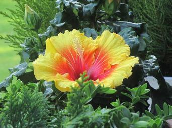 Keywords: hibiscus flower blossom bloom yellow orange ornamental plant