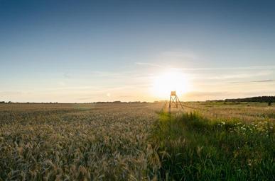 Keywords: hide stand field grain crop agriculture farmland grass countryside hunting observation lookout seat high view shelter farming cultivation barley sunset evening