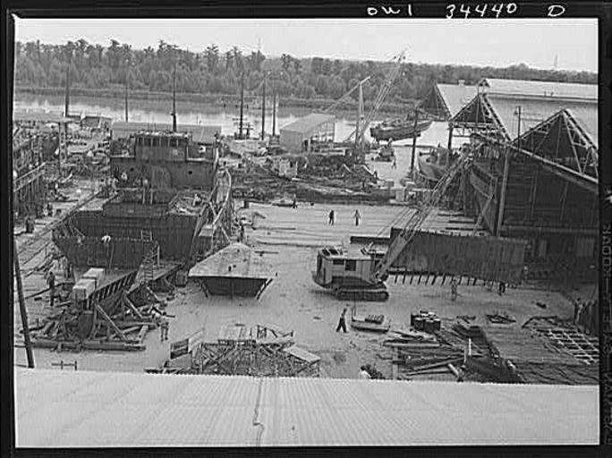 Keywords: HigginsCargoVesselCranes.jpg World War II shipyard work in New Orleans Higgins shipyards New Orleans Louisiana Cargo vessel under construction <br> I believe the body of water seen in the background would be either Bayou St John or the London Avenue Canal Photograph by John Vachon United States Office of War Information Overseas Picture Division Washington Division via Library of Congress site at http //lcweb2 loc gov/cgi-bin/query/h pp/PPALL field NUMBER+ band fsa+8d39891 1943-06 Creator John Vachon PD-USGov 1943 in New Orleans Cranes Higgins shipyards John Vachon