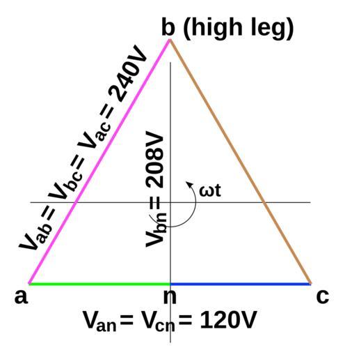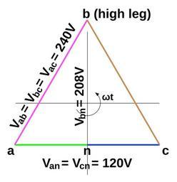 | Keywords: High leg delta.svg  high-leg delta electrical transformer configuration Phases a b and c provide three-phase 240V power; while phases a and c each provide single-phase 120V power from the shared neutral n or split-phase 240V power between each other Phase b is known as the high or wild leg running at 208V relative to neutral own Olawlor 2009-11-28 This same concept is illustrated with nonstandard labels and bitmap format here http //en wikipedia org/wiki/File Vector_diag_wildleg PNG Split-phase electric power |
