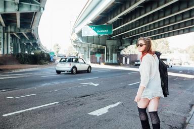 Keywords: highway road overpass east oakland young girl sunglasses brunette shorts knee high socks walking pedestrian people