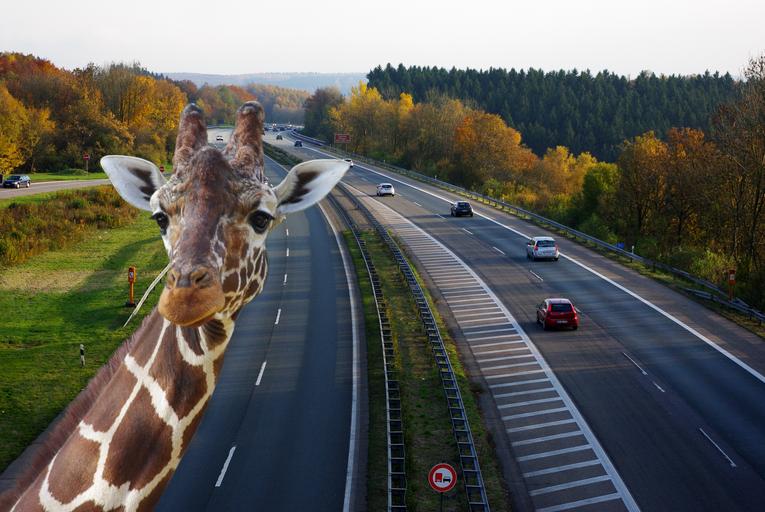 Keywords: highway traffic speed road bridge lane asphalt highway bridge vehicles autos street sign expressway road transport guard rail giraffe animal photo montage composing mammal nature neck