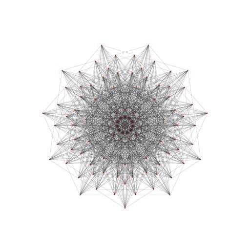 | Keywords: Higman-Sims-05.svg Higman-Sims graph as an orthogonal projection from a subset of the Leech lattice emphasizing a rotational symmetry of order 11 There are 11 possible such projections if we require all 22 points connected to the center point to form a regular 22-gon around it graphe de Higman-Sims comme projection orthogonale d'un sous-ensemble du réseau de Leech mettant en évidence une symétrie rotationnelle d'ordre 11 Il y a 11 telles projections possibles si on impose aux 22 points reliés au point central de former un 22-gone régulier autour de lui own Gro-Tsen 2010-10-30 Higman-Sims Graph |