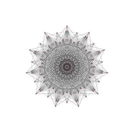 | Keywords: Higman-Sims-09.svg Higman-Sims graph as an orthogonal projection from a subset of the Leech lattice emphasizing a rotational symmetry of order 11 There are 11 possible such projections if we require all 22 points connected to the center point to form a regular 22-gon around it graphe de Higman-Sims comme projection orthogonale d'un sous-ensemble du réseau de Leech mettant en évidence une symétrie rotationnelle d'ordre 11 Il y a 11 telles projections possibles si on impose aux 22 points reliés au point central de former un 22-gone régulier autour de lui own Gro-Tsen 2010-10-30 Higman-Sims Graph |