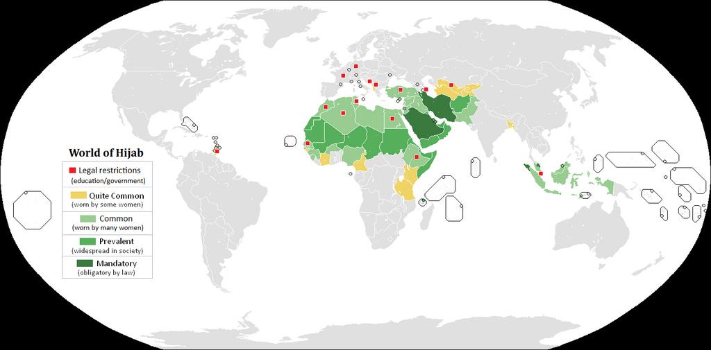| Keywords: Hijab world2.png  law-related map Highly inaccurate map see talkpage en Map showing prevalence of Hijab wear across the world and indicating countries where there are restrictions on wearing it own <br>Legal restrictions sources by country <br> Azerbaijan http //www islam com az/modules/news/article php storyid 1098 Morocco http //www prohijab net/english/morocco-hijab-news htmhttp //news bbc co uk/1/hi/world/africa/5413808 stmhttp //parlemento wordpress com/2009/09/30/lambassadeur-du-maroc-a-bruxelles-pour-linterdiction-du-voile-islamique/ Tunisia http //news bbc co uk/1/hi/world/africa/5382946 stmhttp //news bbc co uk/1/hi/world/africa/6053380 stmhttp //www magharebia com/cocoon/awi/xhtml1/en_GB/features/awi/features/2006/10/27/feature-01 Tunisia http //news bbc co uk/1/hi/world/africa/5382946 stmhttp //news bbc co uk/1/hi/world/africa/6053380 stmhttp //www magharebia com/cocoon/awi/xhtml1/en_GB/features/awi/features/2006/10/27/feature-01http //jurist law pitt edu/paperchase/2006/10/tunisia-presses-enforcement-of-muslim php Egypt http //www quantara de/webcom/show_article php/_c-549/_nr-13/_p-1/i html PHPSESSID 133099http //news bbc co uk/1/hi/world/middle_east/3087220 stm Algeria http //news bbc co uk/1/hi/world/africa/7363456 stm Turkey http //www unhcr org/refworld/country IRBC TUR 4885a91a8 0 htmlhttp //www timesonline co uk/tol/news/world/middle_east/article1752230 ecehttp //news bbc co uk/1/hi/in_depth/world/2002/islamic_world/2144316 stmhttp //news bbc co uk/1/hi/world/europe/7441227 stmhttp //news bbc co uk/1/hi/world/europe/country_profiles/1023189 stm France http //news bbc co uk/1/hi/world/europe/3619988 stmhttp //hrw org/english/docs/2004/02/26/france7666 htm Germany http //news bbc co uk/1/hi/world/europe/3591043 stmhttp //www islamfortoday com/hijabgermany htm Senegal http //www islamicvoice com/january 2000/news htm HIJ Singapore http //news bbc co uk/1/hi/talking_point/debates/south_asian/1803073 stm Kosovo http //www bbc co uk/news/world-europe-11065911 Candelabra 2008-09-29 thumb Hijabs Maps of the world without Antarctica |