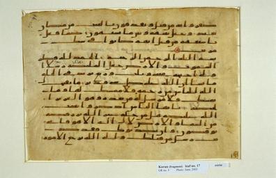 Keywords: Hijazi script - Qur'anic verses.jpg en Verses 53-54 of the 34th chapter of the Qur'an entitled Surat Saba' Sheba as well as the first four verses of the 35th chapter of the Qur'an entitled Surat al-Fatir The Originator The text is executed in Hijazi 1 script in black ink at fifteen lines per page This kind of script is typical of Qur'ans in the horizontal format produced during the 8th century LOC-calligraphy ascs 295 Unknown Calligrapher century 8 PD-Art Hijazi style Qur'an manuscripts 8th century Library of Congress Arabic Persian and Ottoman calligraphy collection |