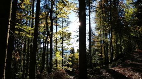 Keywords: hike trees landscape forest nature sunny day autumn colorful sky blue sun back light
