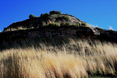 Keywords: hill grass tall light yellow-white rock rockface rock wall sheer grass fringe bush blue sky summer sunlight dried nature