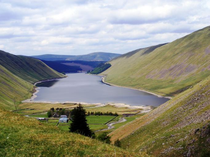 Keywords: hill reservoir lake water sky clouds landscape rural countryside scenic outdoors scenery green valley grass beautiful
