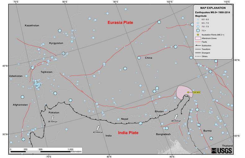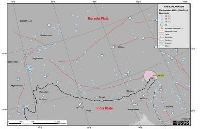 Keywords: Himalayan Tectonic Summary.png en Seismicity in the Himalaya dominantly results from the continental collision of the India and Eurasia plates which are converging at a relative rate of 40-50 mm/yr Northward underthrusting of India beneath Eurasia generates numerous earthquakes and consequently makes this area one of the most seismically hazardous regions on Earth The surface expression of the plate boundary is marked by the foothills of the north-south trending Sulaiman Range in the west the Indo-Burmese Arc in the east and the east-west trending Himalaya Front in the north of India 2015-04-26 http //earthquake usgs gov/earthquakes/tectonic/images/himalaya_tsum pdf United States Geological Survey other versions PD-USGov Uploaded with UploadWizard Maps of 2015 Nepal earthquake |