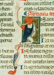 | Keywords: Hippocrates aphorisms illumination.jpg Within the vertical stroke of the initial P of Patet kneeling humanoid grotesque with demonic red furred head large pointed ears or horns naked except for blue cloak red sleeve on r arm holds and blows large horn extending up to l r hand between legs Grotesque half-vine half-bird with blue wings orange beak l appears to bite the sole of demon's foot Adjacent text Hippocrates' Aphorismi Abstract Text in red immediately above image Particula septima Text to immediate right of text Consensus acutis morbis frigiditates extremitatum http //digital2 library ucla edu/viewItem do ark 21198/zz0001062p Unknown artist from Italy-Bologna ~ 1300 PD-old-100 14th-century illuminated manuscripts Files uploaded by PDTillman Medicine in medieval miniatures Aphorisms of Hippocrates |