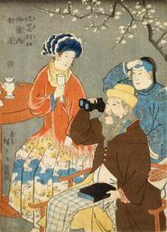 Keywords: Hiroshige II, Amerika, Furansu, Nankin.jpg Amerika Fransu Nankin Japanese 米利加 仏蘭西 南京 America France Nanjing Print shows three spectators viewing an unseen object or event a woman holding a drinking vessel sits beside a man gazing through binoculars while a Chinese man touches his head It is unknown which person represents France and which represents the U S Medium 1 print on hōsho paper woodcut color ; 35 x 25 2 cm block 25 x 25 2 cm sheet LOC-image cph 3g10410 1860 Hiroshige II 広重歌 2代目 PD-Japan Utagawa Hiroshige II Personifications of the United States Personifications of France Personifications of China 1860 in art |
