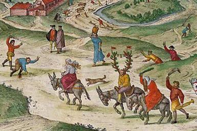 | Keywords: Hispalis (Seville), Braun & Hoefnagel, 1565 (detail).jpg en Detail from the foreground of A view of the city of Seville published in the third volume of Georg Braun's Civitatis Orbis Terrarum 1597 Thisr part of the painting shows a strange scene itemised in the Key as S Execution de Justicia de los cornudos patientes and T Execution de l'acazuettas publicas The patient cuckold a man with bound hands wearing horns made from leafy branches or antlers wrapped with greenery hung with bells and flags and his adulterous wife half-dressed and surrounded by a swarm of bees are riding asses presumably as a punishment for their shameful behaviour Or is his wife the woman on the third ass who appears to be beating him and is in turn being beaten with a strap or belt by the man with a trumpet Five onlookers are making the cabrón the obscene sign of the horns A similar custom in England was sometimes known as a Skimmington Ride or Skimmity http //pamphletofarchitecture blogspot com/ Photographer unknown; artwork originally by Joris Hoefnagel engraved by Franz Hogenberg 1565 published 1597 PD-Art File Hispalis Seville Braun Hoefnagel 1565 jpg PD-Art Maps and topographical views by Joris Hoefnagel Ž Paintings of Seville Public humiliation People with donkeys in art Horns in art |
