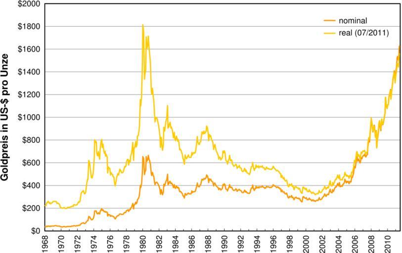 | Keywords: Historical price of gold 07-2011.svg Goldpreis in US- je Unze an der New York Mercantile Exchange Stand Juli 2011 Price of gold on New York Mercantile Exchange in US per fine ounce as of July 2011 CPI-U ftp //ftp bls gov/pub/special requests/cpi/cpiai txt and COMEX http //www wrenresearch com au/downloads/files/mgold csv 2010-08-28 Sponk <span class signature-talk >talk</span> File Historical price of gold 02-2010 svg Translation possible Data <pre> 01/1968 35 20 233 21 02/1968 35 20 232 53 03/1968 39 40 259 51 04/1968 39 10 256 79 05/1968 41 30 270 45 06/1968 41 00 266 94 07/1968 38 75 250 84 08/1968 39 90 257 55 09/1968 10/1968 39 50 252 80 11/1968 40 62 259 24 12/1968 41 72 265 51 01/1969 42 52 269 84 02/1969 42 70 269 47 03/1969 43 40 271 61 04/1969 43 60 271 36 05/1969 43 37 269 18 06/1969 40 90 252 46 07/1969 41 47 254 59 08/1969 40 92 249 86 09/1969 40 85 248 76 10/1969 40 00 242 28 11/1969 35 60 214 48 12/1969 35 17 210 76 01/1970 34 83 208 17 02/1970 34 96 207 85 03/1970 35 10 207 59 04/1970 35 95 210 96 05/1970 35 96 210 47 06/1970 35 40 206 12 07/1970 35 30 204 49 08/1970 35 25 204 20 09/1970 36 23 208 80 10/1970 38 00 217 89 11/1970 37 55 214 23 12/1970 37 40 212 30 01/1971 38 05 215 99 02/1971 38 75 219 41 03/1971 38 82 219 26 04/1971 39 20 220 85 05/1971 40 92 229 40 06/1971 40 15 223 42 07/1971 42 90 238 13 08/1971 42 85 237 27 09/1971 42 65 236 17 10/1971 42 50 234 76 11/1971 43 40 239 73 12/1971 43 55 239 39 01/1972 46 20 253 96 02/1972 48 64 266 07 03/1972 48 40 264 12 04/1972 49 30 268 38 05/1972 59 40 322 59 06/1972 64 00 346 74 07/1972 66 50 358 56 08/1972 66 85 359 59 09/1972 68 75 368 93 10/1972 64 75 345 83 11/1972 63 55 338 62 12/1972 65 00 345 53 01/1973 68 80 364 87 02/1973 82 00 431 83 03/1973 90 75 473 50 04/1973 90 70 469 98 05/1973 126 00 648 43 06/1973 122 00 623 59 07/1973 115 60 589 54 08/1973 105 10 526 48 09/1973 97 75 488 58 10/1973 98 00 485 53 11/1973 105 50 519 28 12/1973 111 75 546 47 01/1974 137 50 666 62 02/1974 175 00 837 63 03/1974 172 25 814 12 04/1974 174 70 822 26 05/1974 154 00 715 88 06/1974 149 75 690 45 07/1974 159 00 727 16 08/1974 152 50 689 06 09/1974 147 50 658 57 10/1974 168 25 743 86 11/1974 186 00 815 95 12/1974 193 00 840 13 01/1975 176 50 765 36 02/1975 185 00 796 11 03/1975 176 75 757 72 04/1975 167 05 713 43 05/1975 172 00 730 42 06/1975 162 40 684 51 07/1975 168 40 701 94 08/1975 161 85 673 40 09/1975 128 75 532 74 10/1975 142 70 587 23 11/1975 141 40 577 67 12/1975 140 75 572 95 01/1976 126 25 513 00 02/1976 132 45 536 26 03/1976 128 70 520 15 04/1976 128 70 518 29 05/1976 124 50 497 83 06/1976 123 70 492 02 07/1976 114 15 451 65 08/1976 104 38 410 83 09/1976 116 25 455 96 10/1976 124 00 483 84 11/1976 130 50 508 32 12/1976 134 63 522 61 01/1977 132 38 511 24 02/1977 143 13 547 14 03/1977 148 88 565 30 04/1977 147 38 554 94 05/1977 143 20 536 52 06/1977 143 13 532 72 07/1977 144 38 534 73 08/1977 146 13 539 44 09/1977 154 38 568 04 10/1977 161 63 592 79 11/1977 160 13 584 44 12/1977 165 13 600 75 01/1978 175 88 635 76 02/1978 182 63 655 96 03/1978 183 63 654 35 04/1978 170 63 603 27 05/1978 184 38 645 82 06/1978 183 38 635 42 07/1978 200 63 689 90 08/1978 208 13 712 44 09/1978 217 38 738 51 10/1978 241 13 811 87 11/1978 193 38 648 20 12/1978 226 38 755 45 01/1979 233 88 773 63 02/1979 251 63 822 70 03/1979 238 63 772 37 04/1979 246 38 788 42 05/1979 275 63 870 92 06/1979 279 88 874 56 07/1979 298 88 923 72 08/1979 316 38 968 53 09/1979 398 00 1205 32 10/1979 382 50 1149 14 11/1979 415 75 1237 51 12/1979 526 50 1550 82 01/1980 653 00 1896 23 02/1980 637 00 1823 98 03/1980 494 50 1394 74 04/1980 518 00 1444 79 05/1980 535 50 1478 99 06/1980 653 50 1785 25 07/1980 614 25 1678 02 08/1980 631 25 1712 04 09/1980 666 75 1793 26 10/1980 629 00 1675 77 11/1980 619 75 1637 60 12/1980 589 50 1543 23 01/1981 506 50 1315 28 02/1981 489 00 1256 84 03/1981 513 75 1311 50 04/1981 482 75 1224 06 05/1981 479 25 1205 71 06/1981 426 00 1062 28 07/1981 406 00 1001 36 08/1981 425 00 1040 27 09/1981 428 75 1039 31 10/1981 427 00 1032 86 11/1981 414 50 999 41 12/1981 400 00 961 37 01/1982 387 00 927 17 02/1982 362 60 865 95 03/1982 320 00 765 03 04/1982 361 25 860 00 05/1982 325 25 767 03 06/1982 317 50 739 49 07/1982 342 90 794 55 08/1982 411 50 951 55 09/1982 397 00 916 15 10/1982 423 25 973 74 11/1982 436 00 1005 12 12/1982 448 00 1037 02 01/1983 499 50 1153 87 02/1983 408 50 942 69 03/1983 414 75 957 11 04/1983 429 25 983 54 05/1983 437 50 996 38 06/1983 416 00 944 56 07/1983 422 00 954 35 08/1983 414 25 934 01 09/1983 405 00 908 62 10/1983 382 00 854 48 11/1983 405 00 904 13 12/1983 381 50 850 83 01/1984 373 75 828 64 02/1984 394 25 869 82 03/1984 388 50 855 46 04/1984 375 80 823 49 05/1984 384 25 839 56 06/1984 373 05 812 73 07/1984 342 35 742 98 08/1984 348 25 752 89 09/1984 343 75 739 63 10/1984 333 50 715 53 11/1984 329 00 705 87 12/1984 308 30 661 46 01/1985 306 65 656 67 02/1985 287 75 613 29 03/1985 329 25 699 11 04/1985 321 35 679 14 05/1985 314 00 661 13 06/1985 317 75 667 16 07/1985 327 50 686 36 08/1985 333 25 697 12 09/1985 325 75 679 54 10/1985 325 10 675 69 11/1985 325 30 674 24 12/1985 326 80 675 49 01/1986 350 50 722 50 02/1986 338 15 698 95 03/1986 344 00 714 31 04/1986 345 75 719 27 05/1986 343 20 712 00 06/1986 346 75 715 42 07/1986 357 50 737 60 08/1986 384 70 792 27 09/1986 423 20 867 61 10/1986 401 00 821 35 11/1986 389 50 797 07 12/1986 388 75 794 82 01/1987 400 50 813 68 02/1987 405 85 821 60 03/1987 421 00 848 47 04/1987 453 25 908 60 05/1987 451 00 900 89 06/1987 447 30 890 35 07/1987 462 50 918 18 08/1987 453 40 895 39 09/1987 459 50 902 71 10/1987 468 80 918 58 11/1987 492 50 964 18 12/1987 484 10 947 74 01/1988 458 00 894 32 02/1988 426 15 829 97 03/1988 456 95 886 14 04/1988 449 00 866 26 05/1988 455 50 875 81 06/1988 436 55 835 82 07/1988 436 80 832 77 08/1988 427 75 812 09 09/1988 396 70 748 11 10/1988 412 40 775 13 11/1988 422 60 793 64 12/1988 410 25 769 17 01/1989 394 00 735 04 02/1989 387 00 719