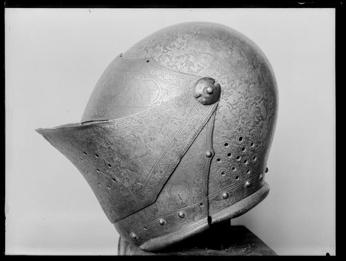 | Keywords: Hjälm - Livrustkammaren - 51458.tif Hjälm med hjälmklocka med antydd kam pannklaff visir och hakstycke de tre senare rörliga runt stora nitar på vardera sidan Nertill på klockan 13 runda hål ordnade i fem rader 2 4 1 4 2 Klockan och hakstycket nertill utkragade till en snedräfflad vulst avsedd att passa om ringkragens överkant Därovanför en rad med nitar med runda huvuden På pannklaffen framtill två rektangulära siktöppningar Visiret framdraget i en spets och genombrutet av 9 lufthål på vardera sidan åtta i ring samt ett i mitten På h sida vid överkanten ytterligare ett runt hål <br/><br/>Rik högetsad dekor i form av blom- och bladrankor längs hjälmkammen en snedräfflad vulst flankerad av en bladranka och kantlinje på vardera sidan På h sida ett stort krönt upprättstående lejon som i framtassarna håller en kartuschsköld med tre kronor på v sida motsvarande lejon hållande en sköld med Vasa-kärven <br/><br/>På pannklaffens båda sidor ovanför siktöppningen två mot mitten gående gripar på klaffens vågräta del rankverk och i mitten en sittande bevingad mänsklig gestalt <br/><br/>Hakstyckets dekor mycket sliten rankverk med en uggla upptill på vardera sidan nertill på vardera sidan två mycket otydliga människor till v en man med stav och börda på ryggen till h en man med palmkvist samt en kvinna stående på en trofégrupp med en örn <br/><br/>Första gången upptagen i inventarium 1624 Torner Körisch som ähr förlopne Kopparst e på arbethade och skole förässas ryg och bröst samt Helmelijnen ähr vtarbetat Hjälmen enl vägledning 1921under lång tid försvunnen från Livrustkammaren men enl Wijk-inventariet köpt av greve G A F W von Essen av Åkerstein och återlämnad till LRK original caption hjälm - LRK 23421 ca 1620 steel R - RUSTNINGAR material stål g 3325 size mm 250 size mm 180 nedtill size mm 310 vid visirspetsen LRK Gustav II Adolf av Sverige Gustav II Adolf 350 år efter Lützen 1982-1984 Riddarlek och tornerspel 1993-1995 Modelejon 2002 Sweden and Europe 1632-1792 2003-2004 Tornerutrustning från GIIA s tid place of origin Stockholm original filename LN_A00956_000956 60019 inventory number LRK 23421 51458 CC0 Hjälm - Livrustkammaren - 51458-negative tif <gallery caption Different images of same object > File Hjälm från praktrustning etsad dekor av Johan Neuman Stockholm 1620-1621 - Livrustkammaren - 35517 tif File Hjälm J Neumann - Livrustkammaren - 60129 tif File Hjälm J Neumann - Livrustkammaren - 203 tif File Hjälm från praktrustning etsad dekor av Johan Neuman Stockholm 1620-1621 - Livrustkammaren - 52636 tif File Hjälm J Neumann - Livrustkammaren - 68691 tif File Hjälm från praktrustning etsad dekor av Johan Neuman Stockholm 1620-1621 - Livrustkammaren - 26956 tif File Hjälm från praktrustning etsad dekor av Johan Neuman Stockholm 1620-1621 - Livrustkammaren - 69747 tif File Hjälm från praktrustning etsad dekor av Johan Neuman Stockholm 1620-1621 - Livrustkammaren - 44076 tif </gallery> Military helmet images from Livrustkammaren Close helmets Media contributed by LSH dim-with multiple size templates Media contributed by LSH unmatched creator Media contributed by LSH 2013-10 |