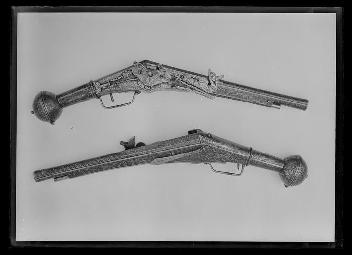 | Keywords: Hjullåspistol, puffert, Nordtyskland (Braunschweig?) ca 1560-1570 - Livrustkammaren - 43271.tif Rund pipa med svag trumf och åttsidig kammare kort försänkt i vinkel böjt svansskruvblad dolt av kolvplåten Pipans ovansida helt täckt av etsad och delvis förgylld dekor ett förgyllt tvärband i båda ändar på pipan och däremellan rankdekor mot prickbakgrund På den kantiga delen en förgylld man helbild profil h barett med plym midjekort mantel pluderhosor värja På den runda delen en kvinna helbild profil v lång veckad kjol med tvärbårder överdel med långa hängande ärmar kort plagg över axlarna v hand vid midjan h hand lyft framför ansiktet hållande spegel runt föremål med hundliknande drag skaft Båda figurerna står i fält som framtill avslutas med trepassformig båge med krön i form av fransk lilja Pipans undersida endast grovfilad <br/>Fästning Två häften Pipan fäst med krysskruv samt två pipstift av stål <br/><br/>Hjullås med plant låsbleck med delvis fasade kanter Låsblecket täckt av etsad dekor med bladrankor mot prickbakgrund kantbård av omväxlande tre runda och ett avlångt blankt fält Utvändigt hjul täckt av en rombisk platta och därpå stödram i form av två från nederkanten utstickande från varandra vända etsade drakhuvuden förenade dels nertill dels genom båge med prickdekor ovanför hjulaxeln Drakarna och den rombiska plattan fästade med en skruv genom vardera drakhuvudet Kantig fängpanna på ytterkanten och bakkanten en plan skiva med svängd kant som tillsammans med fängpannas lock bildar en halvcirkel fängpannelocket saknas På skivans ovansida hakan av en grotesk mask jfr nr 17584 På låsbleckets kant därframför en etsad bladranka <br/>Hane med rak kantig kropp på framsidan en utskjutande platta med rundad kant framför käkskruven lös överkäke med antydan till fingergrepp käkskruv med litet fyrsidigt huvud På hanens utsida grövre rankdekor samt antydan till drakhuvud på käkarna Hanfjäder med framtill rundad utsida filade bladrankor dubbelt kraftigt fjäderlöv med dekor som på hanen ena bladet nedanför hjulet det andra uppåtriktat <br/>Låset invändigt svärtat Stor konturerad täckplatta från avtryckare till hjulaxel odjurshuvud framtill <br/>Säkring På låsbleckets bakre del en virvelsäkring L-formig bygel med lång profilerad främre arm avslutad med stort fjäderlöv bakom bygeln ett löv som täcker hela låsbleckets plana del och tvär avslutas vid tungan som skjuts in under kolvplåten Säkring med rinformigt platt grepp profilerad fjäder med dubbelt fjäderlöv som hanfjäderns Fästning Två låsskruvar den bakre samtidigt fästskruv för bältehaken <br/>Avtryckare Rak avtryckare fäst med skruv i kolvplåten <br/><br/>Helstock av stål med i vinkel böjd kolv avslutad med kolvkula kolvkulan delad i två halvor förenade med gångjärn på undersidan fjädrande spärr som nås genom hål i kolvkulan Kolvhalsen rundad framtill en ring med pärlstavsdekor Låsdelen av kolven samt framstocken kantiga sluten laddstocksränna framstocken därframför rundad <br/>Heltäckande etsad dekor i fält åtskilda av blanka linjer fältens botten prickad därpå rankmönster På kolvkulans yttre del bladrankor amt ovanför mittknappen en tom renässanssköld sköldhållare två lejon På kolvkulans fasta del dekor i form av stora flikiga framåtriktade blad På kolvhalsens runda del fem rektangulära fält på ovansidan två med en naken man i det ena och en naken kvinna i det andra halvt vända mot varandra draperingar över skötena På sidorna ytterligare en naken kvinna vänd mot mannen samt på den andra sidan en man i antik rustning och med kroksabel På undersidan en man likaså i antik rustning men med sköld stödd mot marken dessa två är vända mot varandra På kolvryggen därframför fram till pipan ett stort fält med en man i helfigur profil v antik rustning med lejonmaskaron på axeln pluderhosor på huvudet kaskett med plym v hand vid midjan h hand lyft hållande yxa Hela anslagssidan av stocken täcks av ett sotrt fält med bladrankor samt mellan låsskruvarna en ryttare vänd framåt hög hatt med plym dräkt med pluderhosor bakom ryttaren en hund framför honom en hare en hund och en hare På kolvens undersida ett fät runt avtryckaren samt ett fält därframför med bladrankor samt två fåglar d en främre en sittande papegoja På laddstocksrännan längsgående dekor i form av en bladranka hund och hare Som överrörka och näsband ett tvärband med förgylld rankdekor I övrigt har samtliga större figurmotiv rester av förgyllning <br/><br/>Tillbehör <br/>Laddstock av stål l 318 mm original caption ca other date - 1560 1570 steel e1279 - eldvapen - pipa lås stockbeslag och laddstock material stål g 2220 size mm 340 pipa size mm 544 LRK Erik XIV av Sverige Gustav II Adolf av Sverige Tre Konungar på Åbo slott 1993 place of origin original filename LN_B01805_004685 54178 inventory number LRK 17583 43271 CC0 Hjullåspistol puffert Nordtyskland Braunschweig ca 1560-1570 - Livrustkammaren - 43271-negative tif <gallery caption Different images of same object > File Hjullåspistol puffert Nordtyskland Braunschweig ca 1560-1570 - Livrustkammaren - 26246 tif File Hjullåspistol puffert Nordtyskland Braunschweig ca 1560-1570 - Livrustkammaren - 51981 tif </gallery> Wheellock pistol images from Livrustkammaren Media contributed by LSH dim-with multiple size templates Media contributed by LSH 2013-10 |